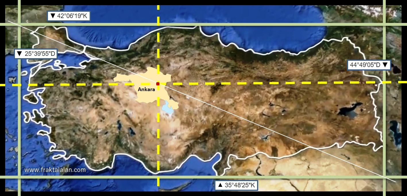 Türkiye Cumhuriyeti’nin en uç noktalarındaki Kuzey enlemleri ve Doğu boylamlarının içinde kalan bölgenin altın oranını hesabettiğimizde tam olarak başkent Ankara’nın yönetim merkezi konumunda bulunan Çankaya ilçesine denk gelmekteyiz.