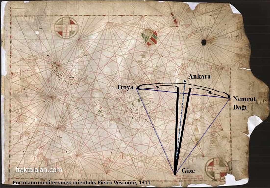1. Ankara’nın başkent seçilmesini ve isminin kökenini, bazı araştırmacılar, Petrus Vesconte’nin 1311 yılında haçlı seferlerini desteklemek için çizdiği klavuz (portolan) haritası ile ilişkilendirir. Söz konusu haritada, Ankara’nın, Troya, Nemrut Dağı ve Gize arasında kalan eşkenar üçgenin, tepe kenar merkezinden geçen doğru üzerinde bulunmasından ötürü sembolik bir çapa oluşturduğunu anlatırlar. Çapa isminin Frigler, Galatlar ve Roma’lılara kadar uzandığı, klasik Yunancada gemi çapası anlamına gelen “Anküra” diye okunduğu ve Türkler Anadolu’ya geldikten sonra da “Ankara”, “Engürü”, “Angora” olarak değiştiği söylenir.